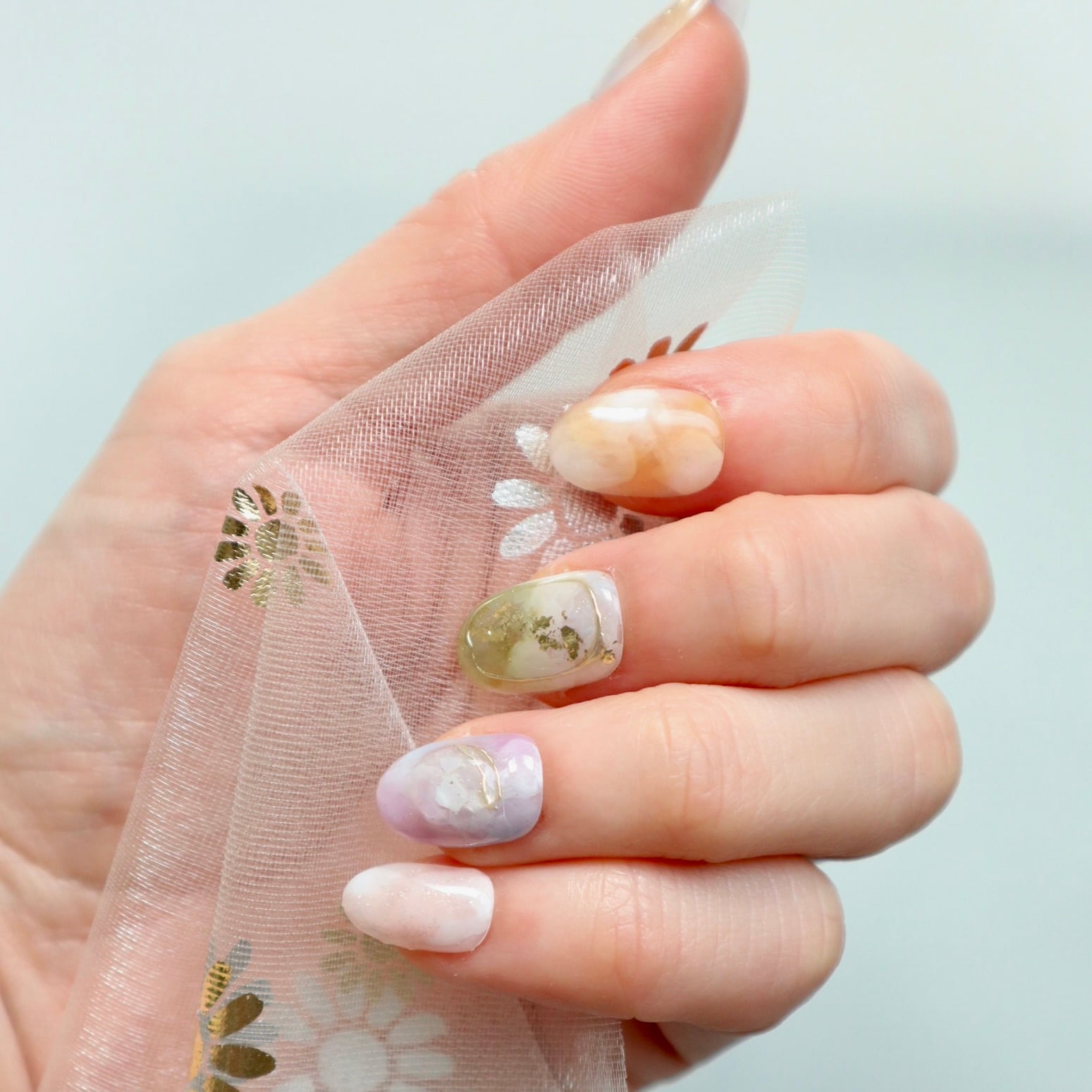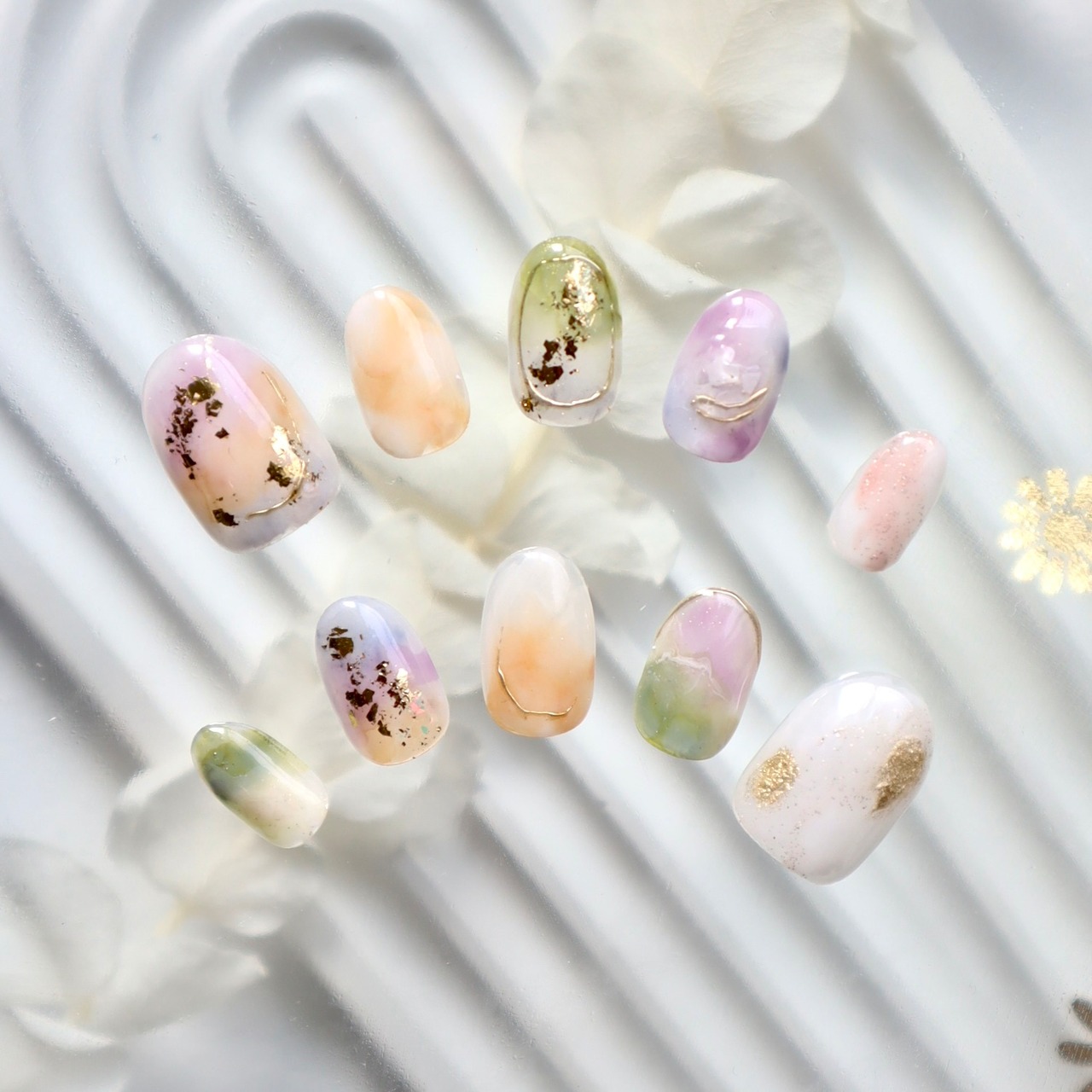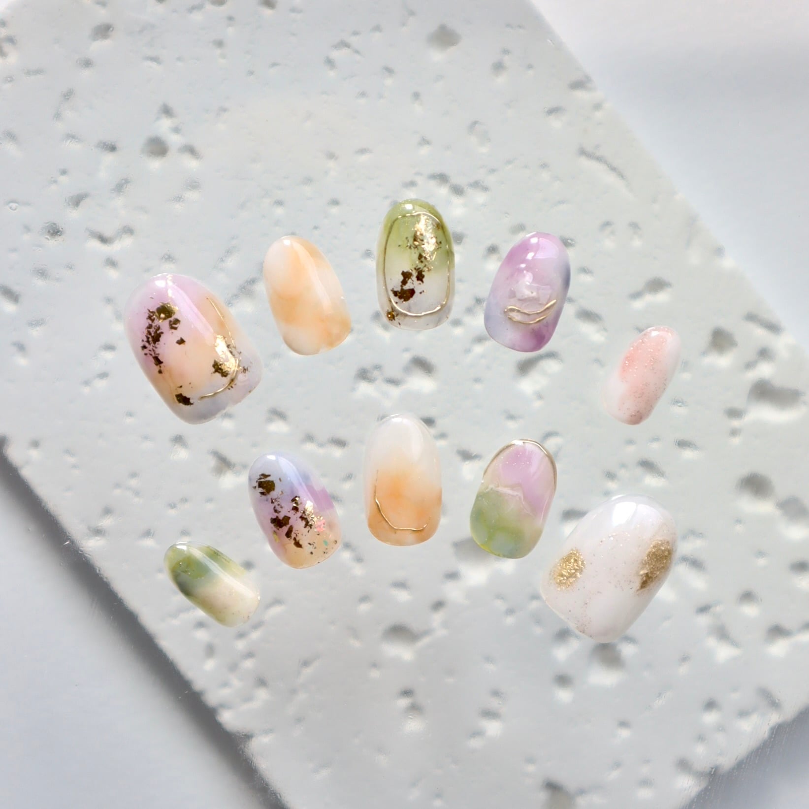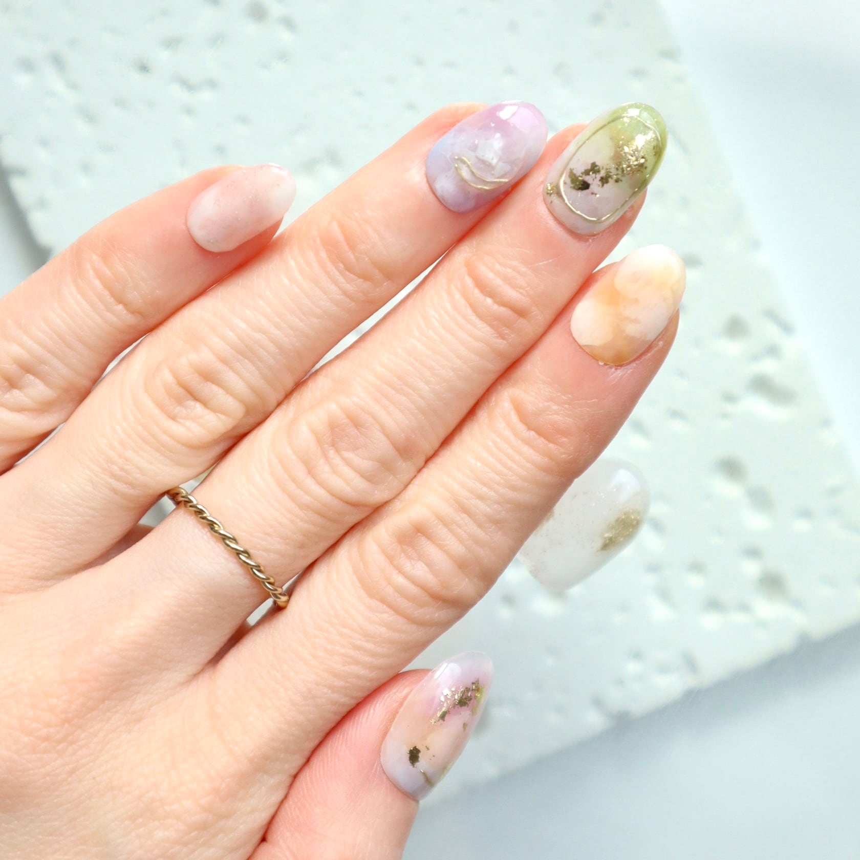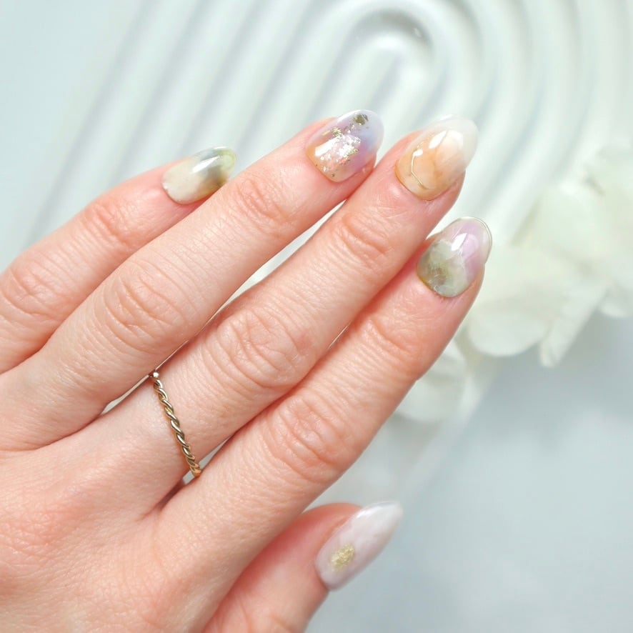 パステルカラーの天然石風ニュアンスネイル|春色くすみ×ゴールド箔デザイン