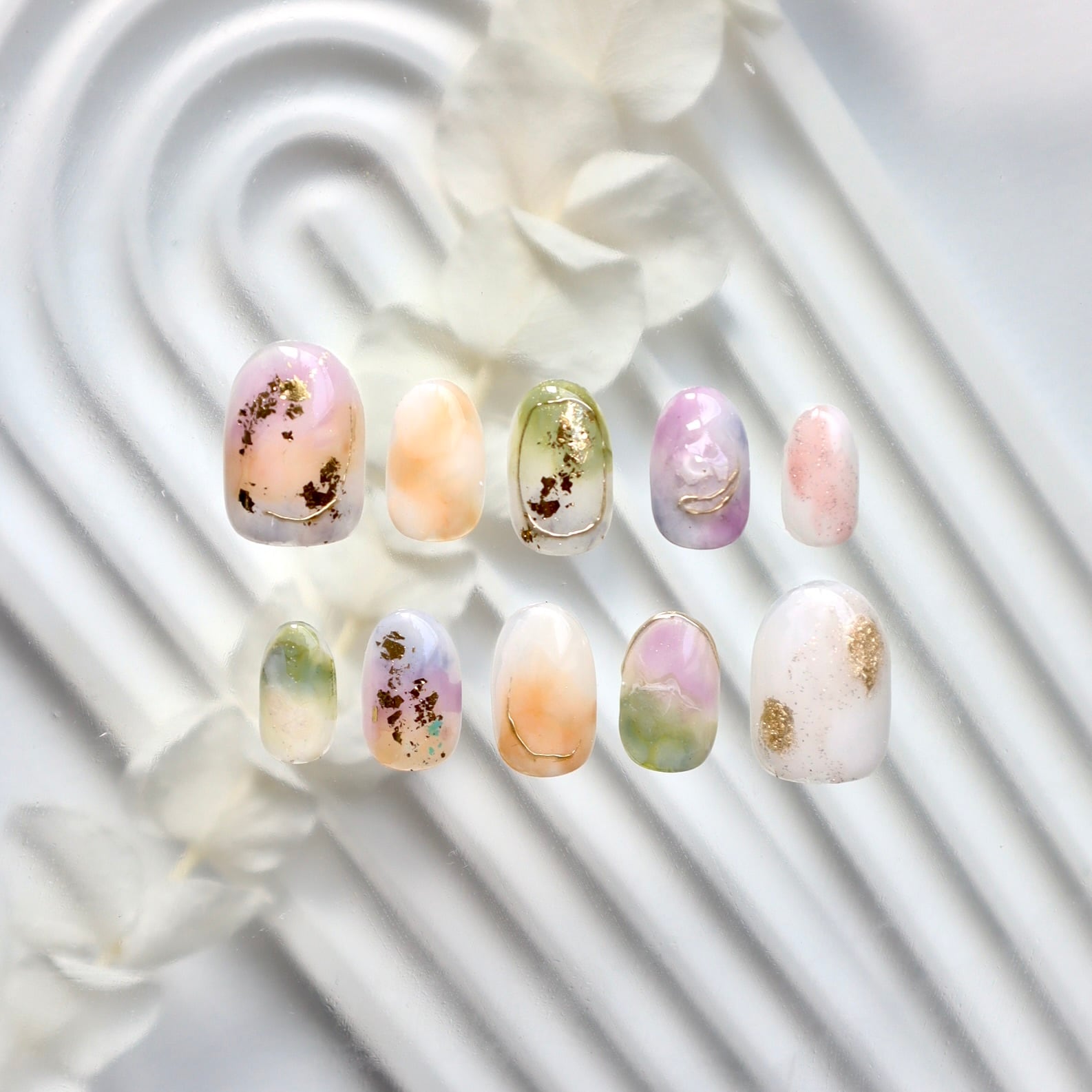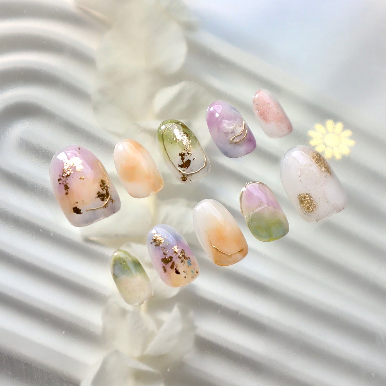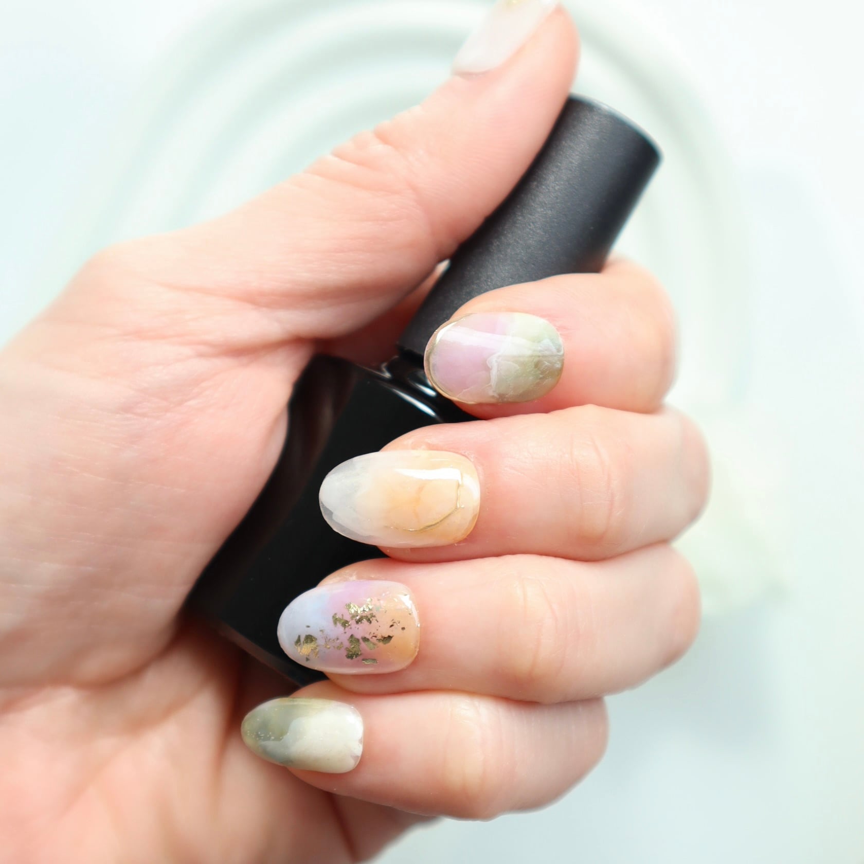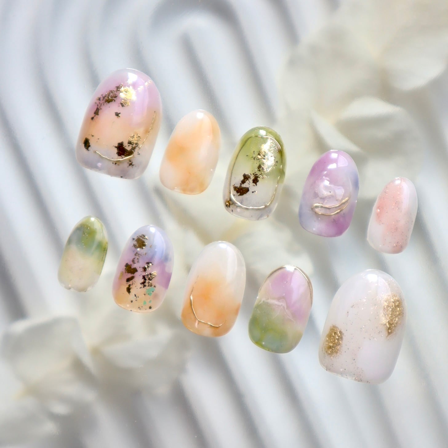 パステルカラーの天然石風ニュアンスネイル|春色くすみ×ゴールド箔デザイン
