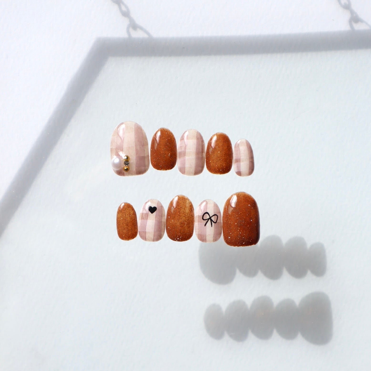 やわらかいベージュのチェック柄に、ちょこんとリボンやハートを添えた、可愛らしさ控えめの大人ガーリーデザインᵕ̈*