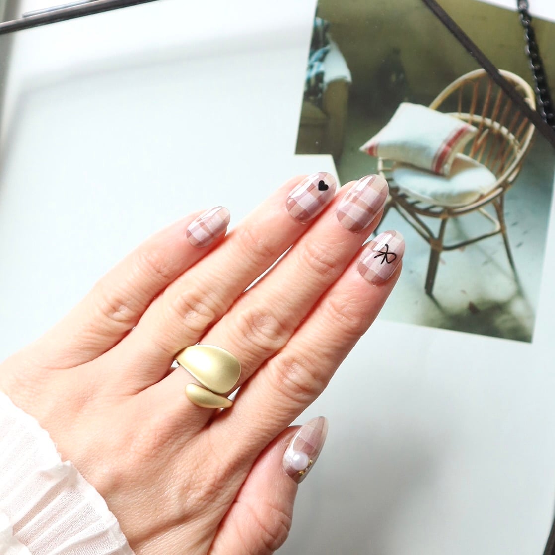 あったかチェック×リボンのネイルチップ