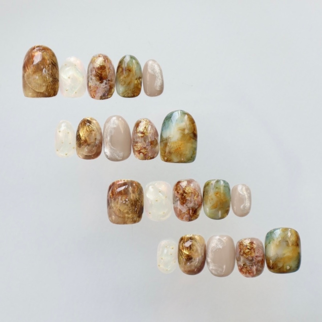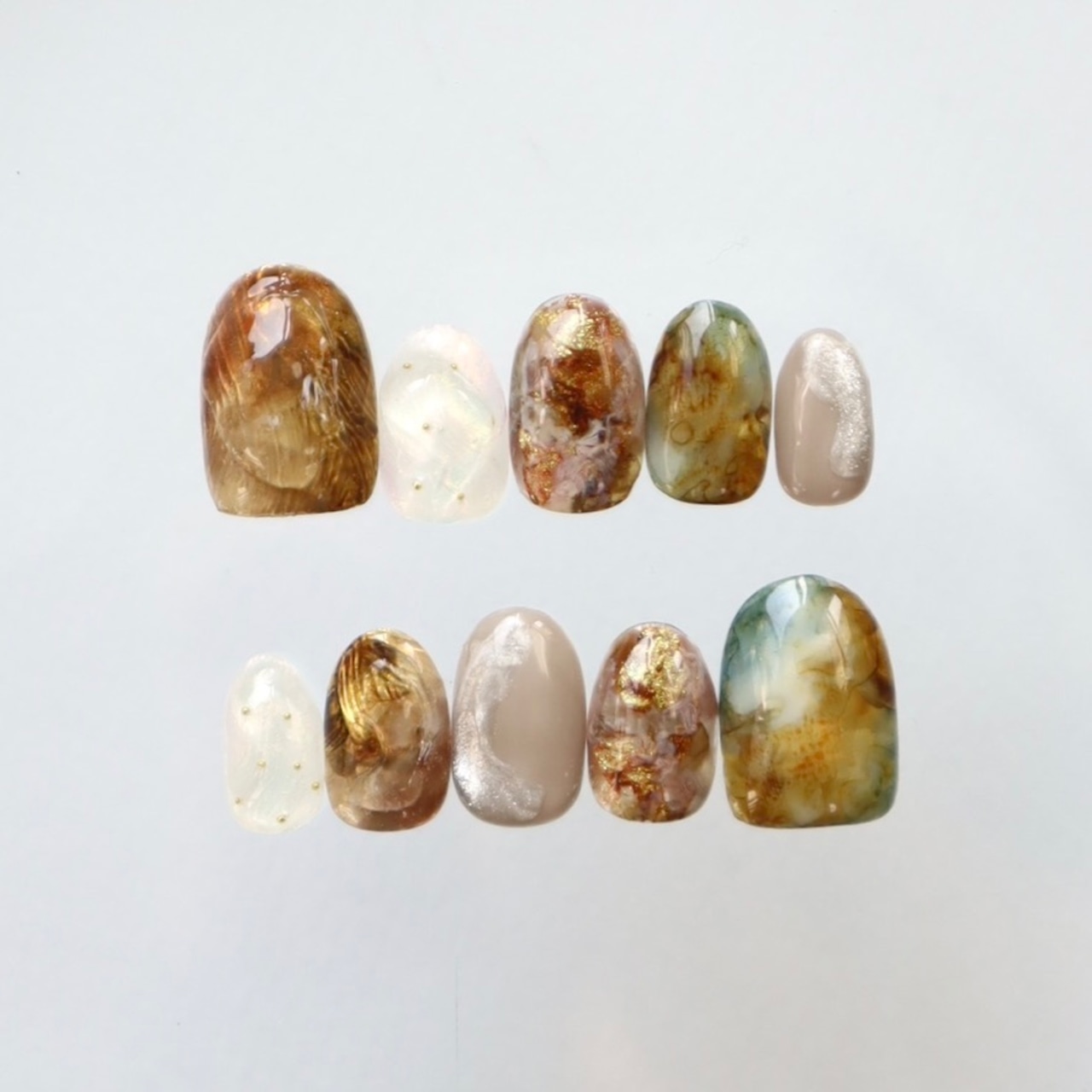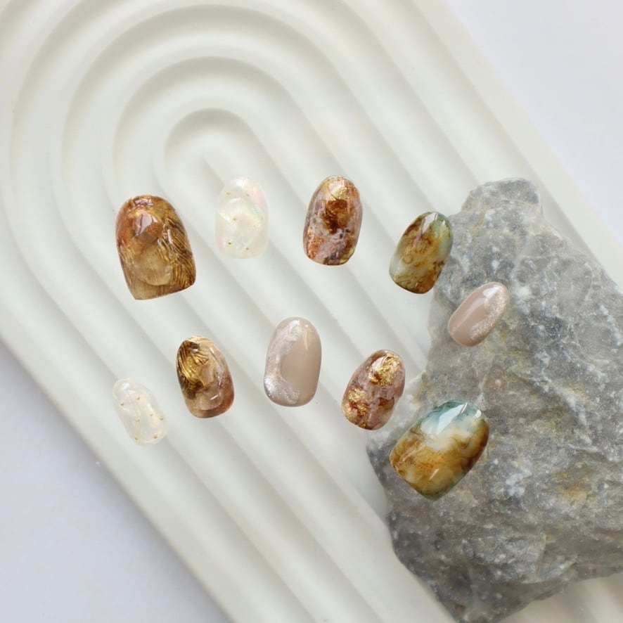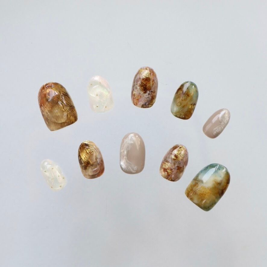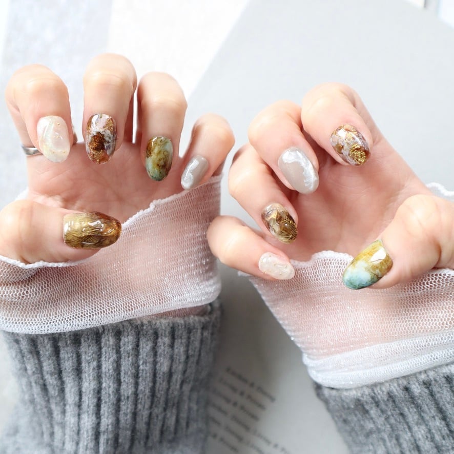 深みのあるブラウンやグリーンを重ねた、自然なニュアンスネイルデザインᵕ̈*
