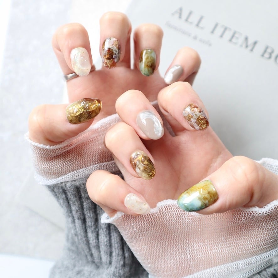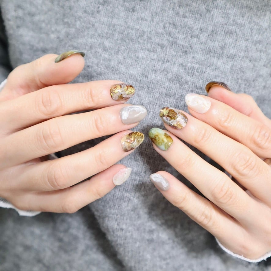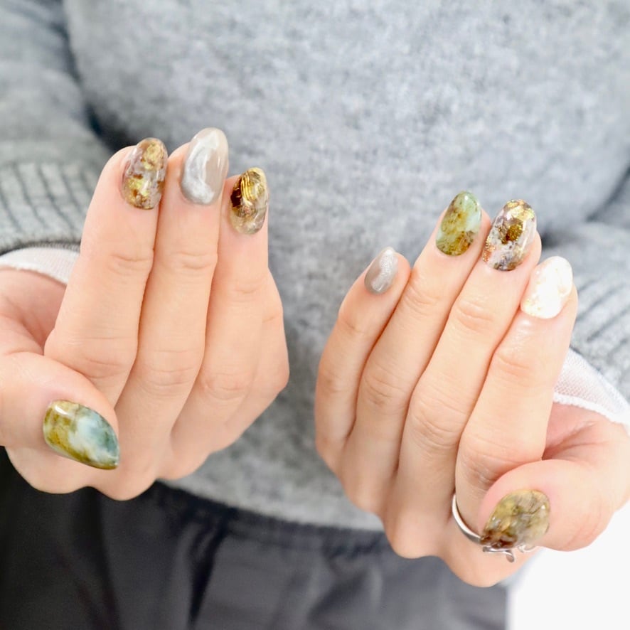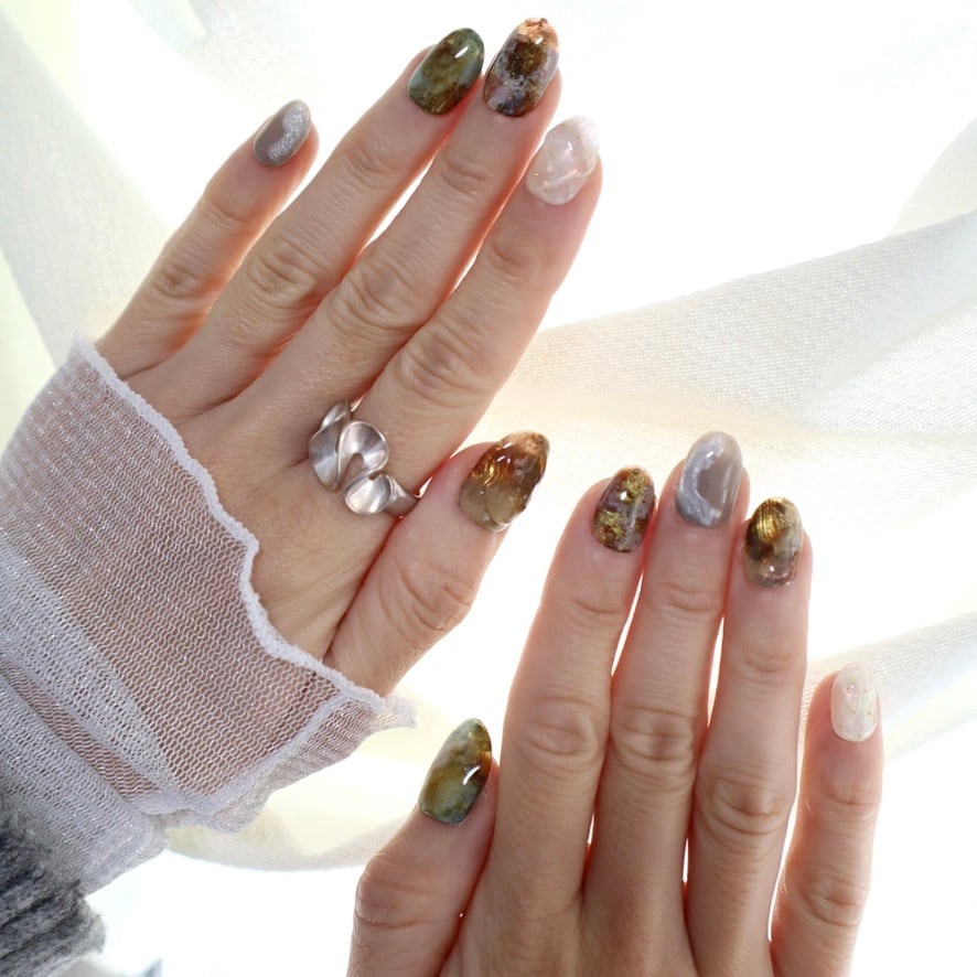 ブラウン×グリーン×ゴールドネイル|奥行きのある大人ニュアンスデザイン